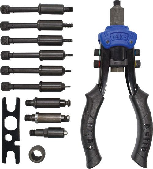 - Includes attachments for blind rivet sizes in 3/32″ (2.4mm), 1/8″ (3.2mm), 5/32″ (4.0mm), 3/16″ (4.8mm), and 1/4″ (6.4mm), rivet nut attachments in M5, M6, M8, 10-24, 1/4″, 5/16″ and round and right-angle sheet metal nibbler