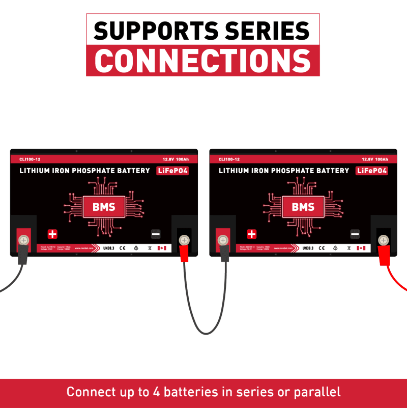 Our high-power lithium iron phosphate batteries can withstand up to 2500+ charge/discharge cycles. LiFePO4 cells have the longest shelf life and can be stored for up to 2 years in any state of charge without the worry of degradation. This makes them exceptional for use in seasonal equipment as they do not require maintenance for long periods of time, such as your sailboat. This 12V 100Ah lithium battery can be connected in parallel up to 4 units of the same model to create a 12V 200Ah,12V 300Ah, or even 12V 400Ah battery. It Can also be connected in series up to 4 units of the same model to create a 24V 100Ah, 36V 100Ah, or even 48V 100Ah battery.