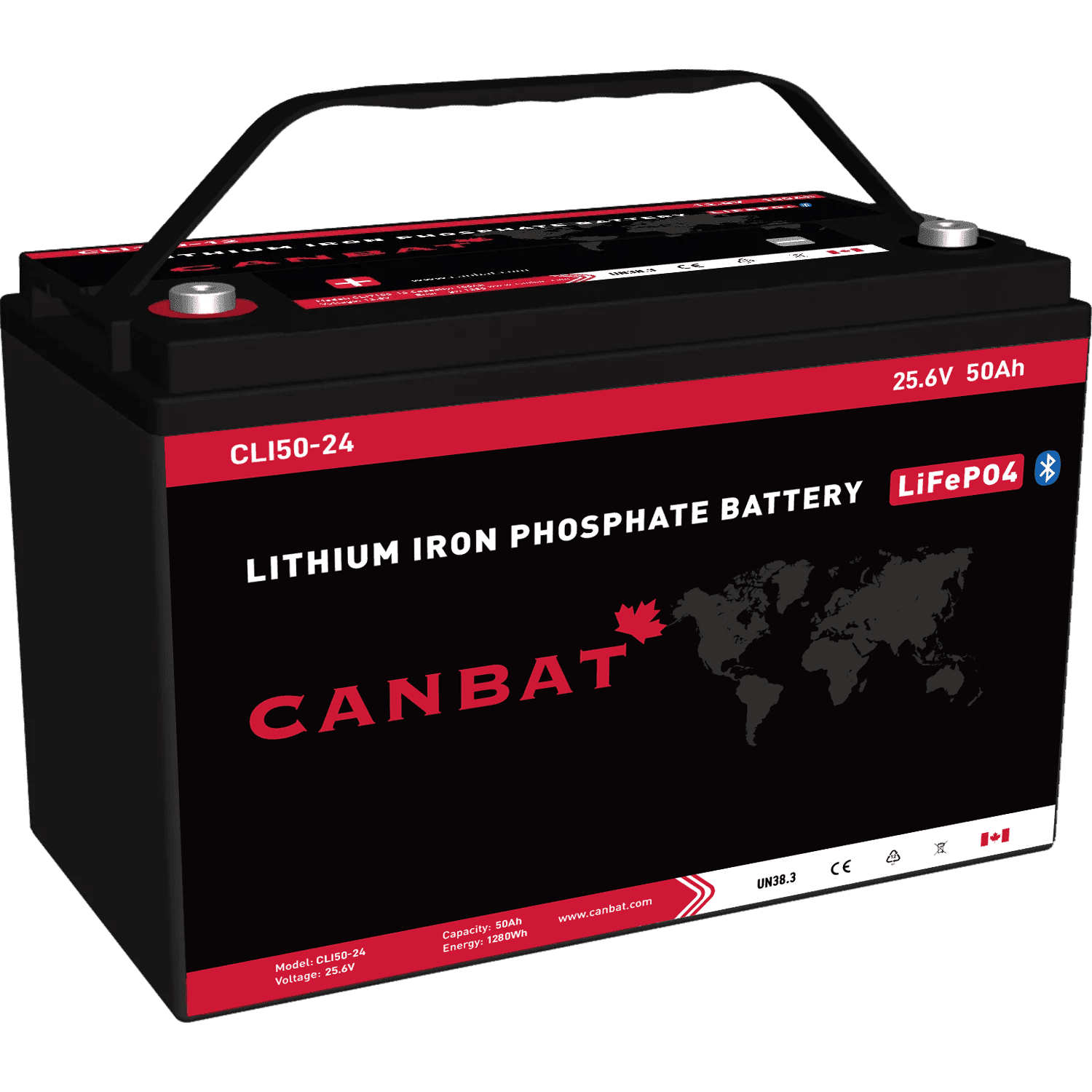 Canbat 24V 50Ah Lithium Iron Phosphate batteries (LiFePO4) are designed to outperform traditional sealed lead-acid batteries in various residential and commercial power applications. This includes recreational vehicles (RV), electric wheelchairs, solar energy, boats, power equipment and more. Lithium batteries offer safe and worry-free energy in a lighter weight solution. Compared to sealed lead-acid batteries and other types of lithium batteries, Canbat lithium iron phosphate batteries are designed with LiFePO technology to offer significant advantages, including improved recharge and discharge efficiency, temperature protection, a higher life cycle and the ability to deep cycle or deep discharge while maintaining power. 24V 50Ah LiFePO4 batteries are generally more expensive than the counterpart sealed lead-acid batteries, but they are actually more cost-effective in the long term because they offer an extended life span of over 10 years.