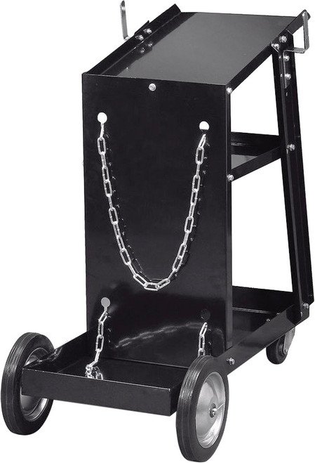 - Sturdy machine cart with shield gas cylinder support features 3-shelves for component storage, large rear wheels, solid axle and large casters for ease of transport throughout the shop.