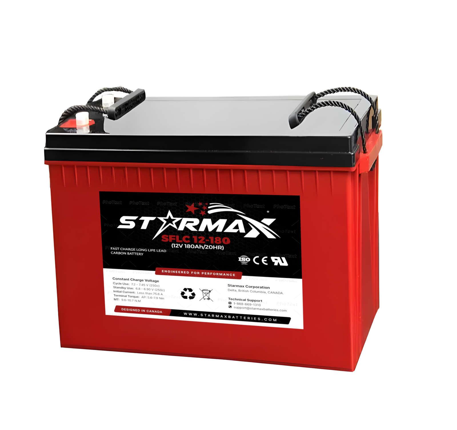 The Starmax SFLC Fast-Charge Long-Life Lead Carbon Battery is a high-performance deep cycle lead carbon battery ideal for solar power systems, off-grid energy storage, wind power applications, sweepers, golf carts, and light industrial electric vehicles. Built for extreme temperatures (-20°C to 60°C), it features low self-discharge, over 3,000 cycles at 50% DOD, and a float service life of ≥20 years. ISO 9001/14001/18001 and CE/IEC certified, this lead carbon battery delivers reliable, long-lasting power for industrial and renewable energy applications.