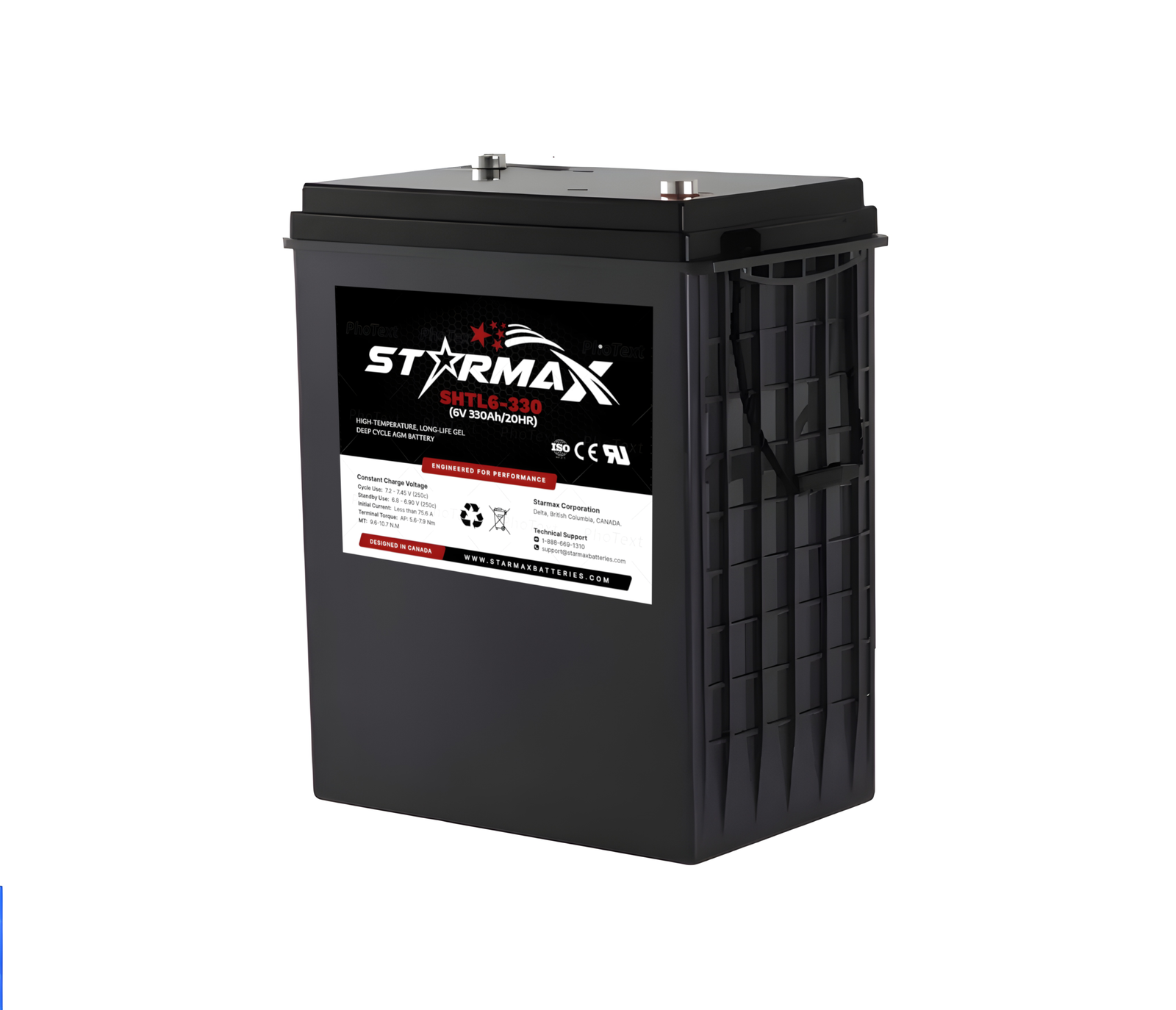 The Starmax High-Temperature GEL Deep Cycle AGM Battery is a high-performance deep cycle GEL AGM battery designed for solar power systems, off-grid energy storage, wind power applications, sweepers, golf carts, and light industrial electric vehicles. Built for extreme temperatures (-15°C to 60°C), it features low self-discharge (2–3% per month at 25°C), a 50% DOD cycle life of over 3,000 cycles, and a float service life of 12–15 years. Supports fast charging and comes with CE, UL, ISO, and IEC certifications. Available in a grey body with black cover, it offers 1–3 years warranty depending on application, providing reliable, long-lasting power for industrial and renewable energy applications.